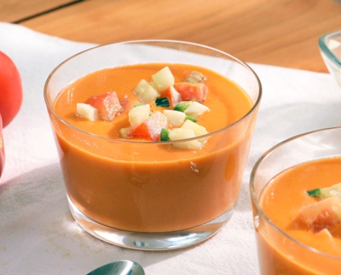 Éste no es más que una sopa fría compuesta por tomates, hortalizas, aceite y vinagre. Tal vez poco llamativo para los más pequeños, pero es que es una de las tapas diseñada para adultos. De hecho, en los bares lo sirven junto a rebanadas de pan, jamón y hasta huevos sancochados.