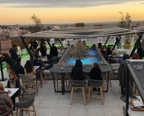 Asombrados quedareis cuando sin haber llegado a la azotea del hotel Riu Plaza España veáis a través de los cristales de la planta 26 el puente “colgante” o pasarela que seguro será la más famosa de Madrid y de España. No os quedéis ahí porque el espectáculo solo empieza. Id hacia las escaleras más cercanas y subid hacia la planta 27 donde realmente se encuentra De Madrid al Cielo. Veréis unas vistas que os dejarán sin palabras.